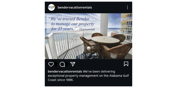 An Instagram post featuring a beautiful location photo paired with a client testimonial overlaid as text. A thoughtful caption and well-chosen hashtags were used to increase reach. Property photo by Steph Stockton.
